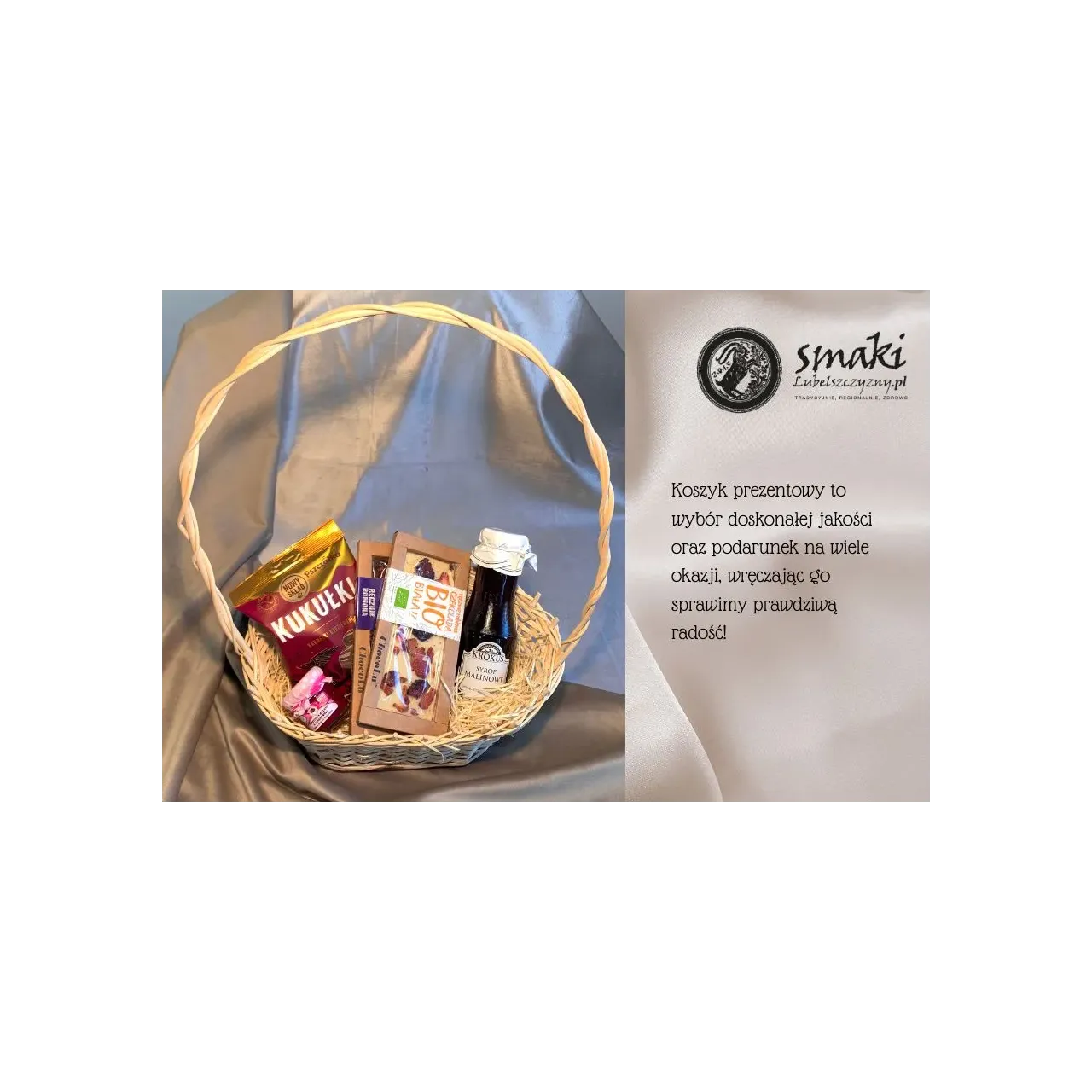 Zestaw prezentowy z koszykiem. Zawiera konfiturę z płatków róży 50g, sok malinowy 280ml, cukierki kukułki 100g, czekolada BIO biała z owocami 53 g, czekolada bez cukru deserowa z owocami 53 g, pięknie zapakowany na prezent. Jeśli zamawiają Państwo bez odbioru osobistego, zabezpieczamy zawartość koszyka pakując w bezpieczny sposób każdy z produktów, w celu wręczenia koszyka należy je odpakować z zabezpieczających folii bąbelkowej.