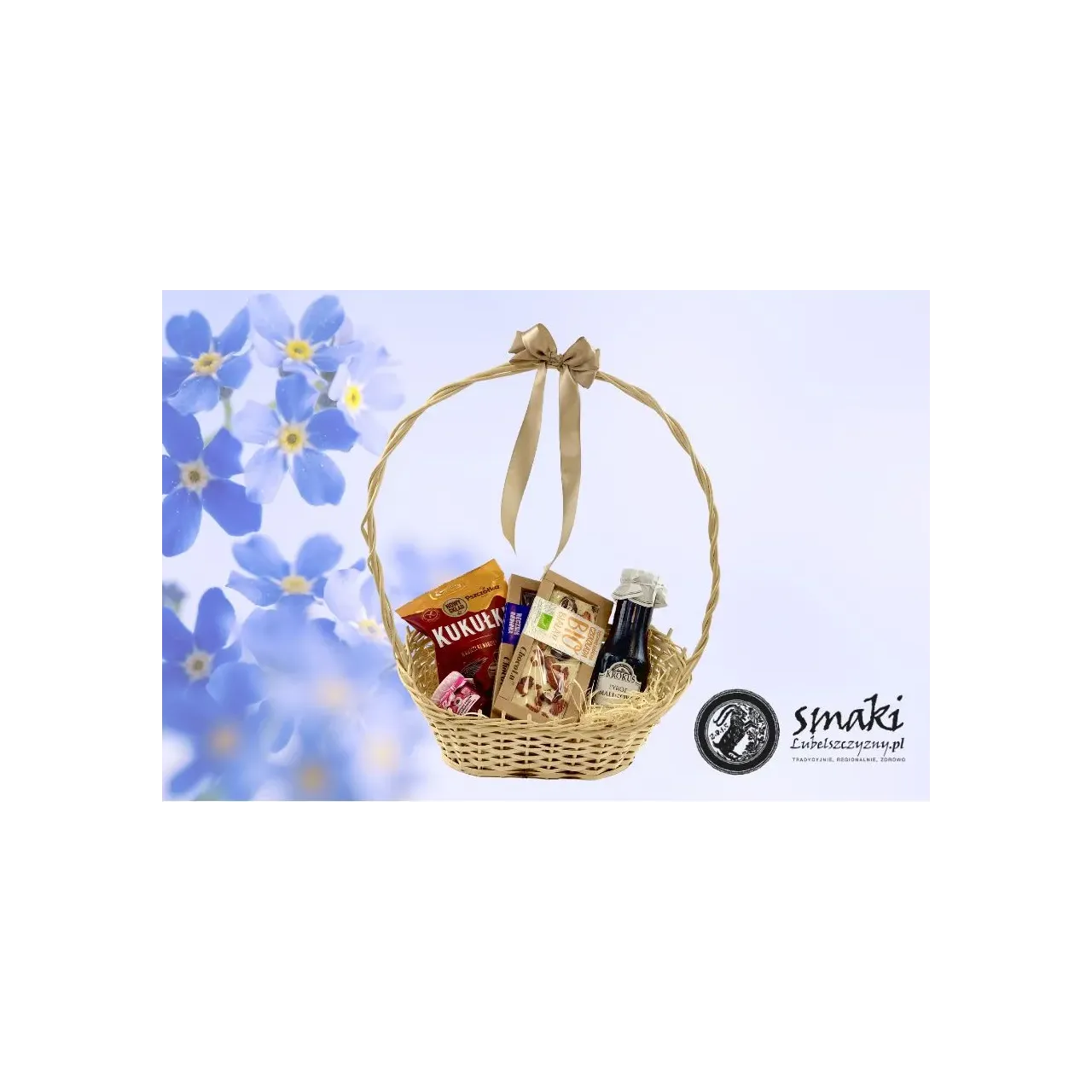 Zestaw prezentowy z koszykiem. Zawiera konfiturę z płatków róży 50g, sok malinowy 280ml, cukierki kukułki 100g, czekolada BIO biała z owocami 53 g, czekolada bez cukru deserowa z owocami 53 g, pięknie zapakowany na prezent. Jeśli zamawiają Państwo bez odbioru osobistego, zabezpieczamy zawartość koszyka pakując w bezpieczny sposób każdy z produktów, w celu wręczenia koszyka należy je odpakować z zabezpieczających folii bąbelkowej.